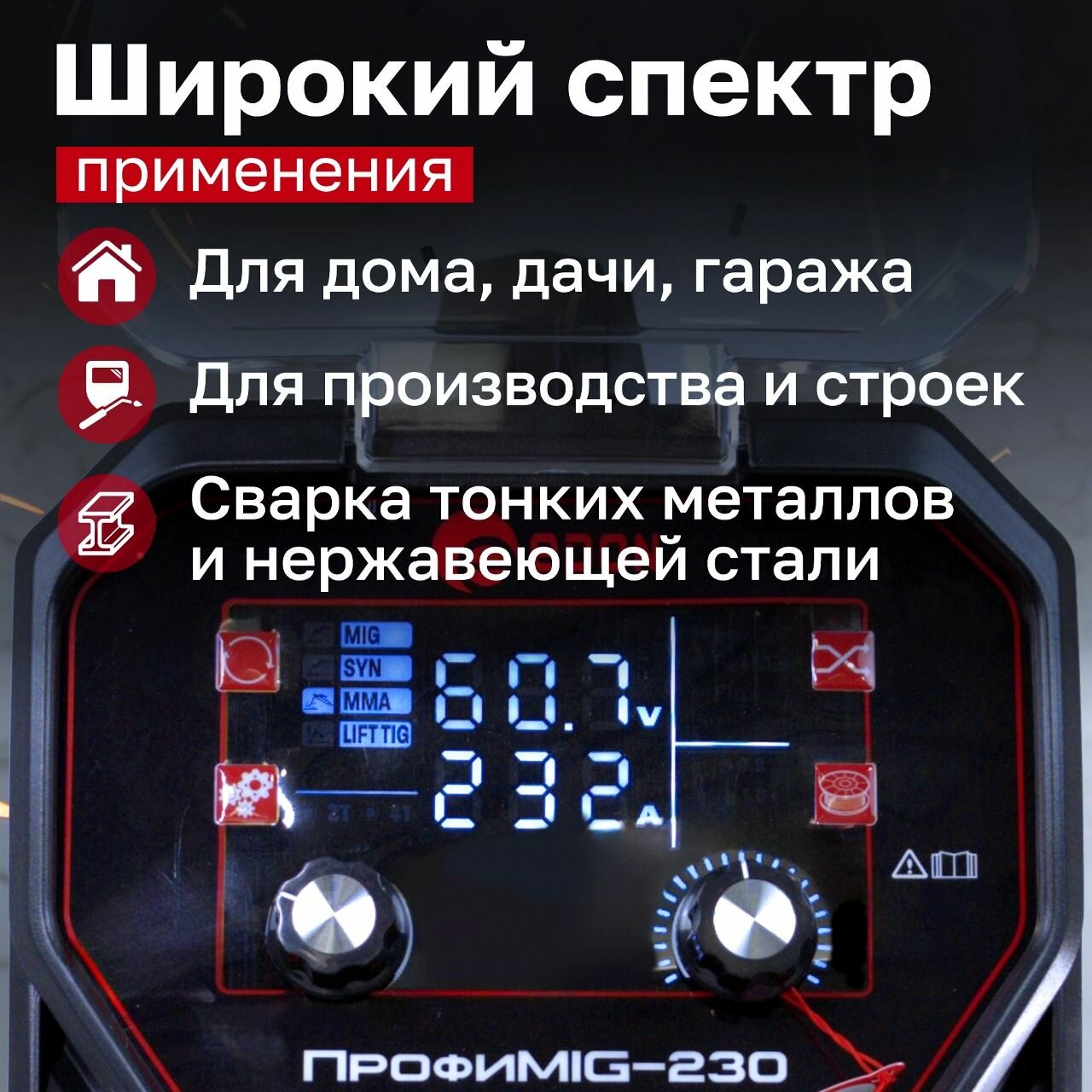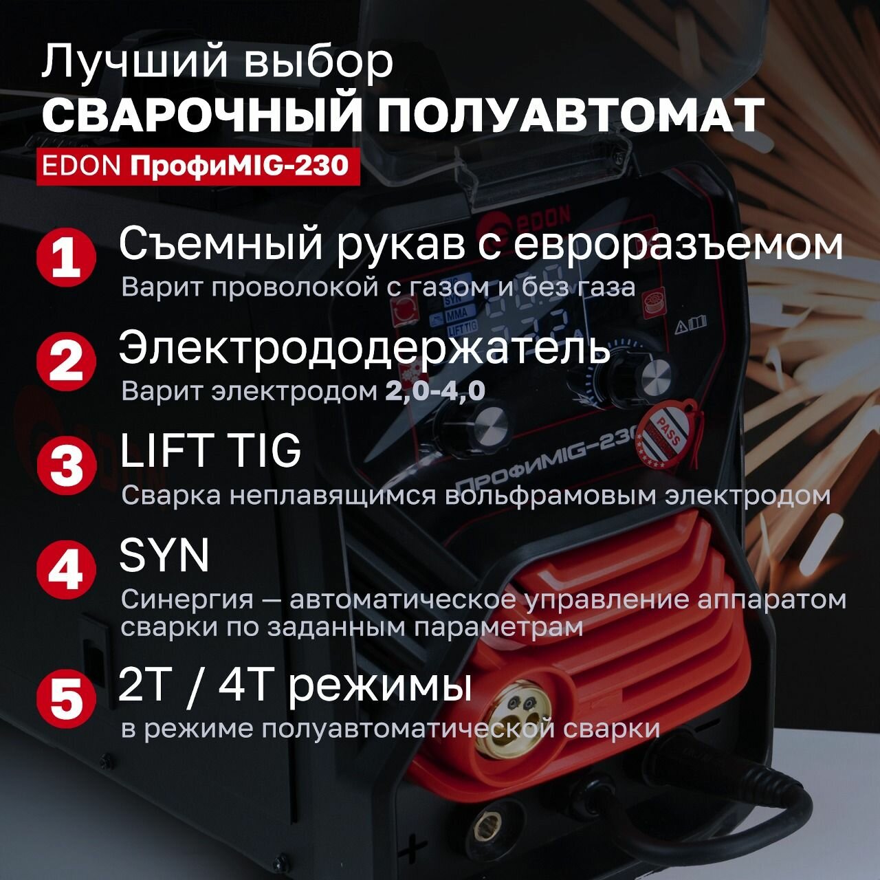 СохранитьСварочный полуавтомат EDON ПрофиMIG-230 7кВт 20-200А, MMA 9,0кВт интересное: