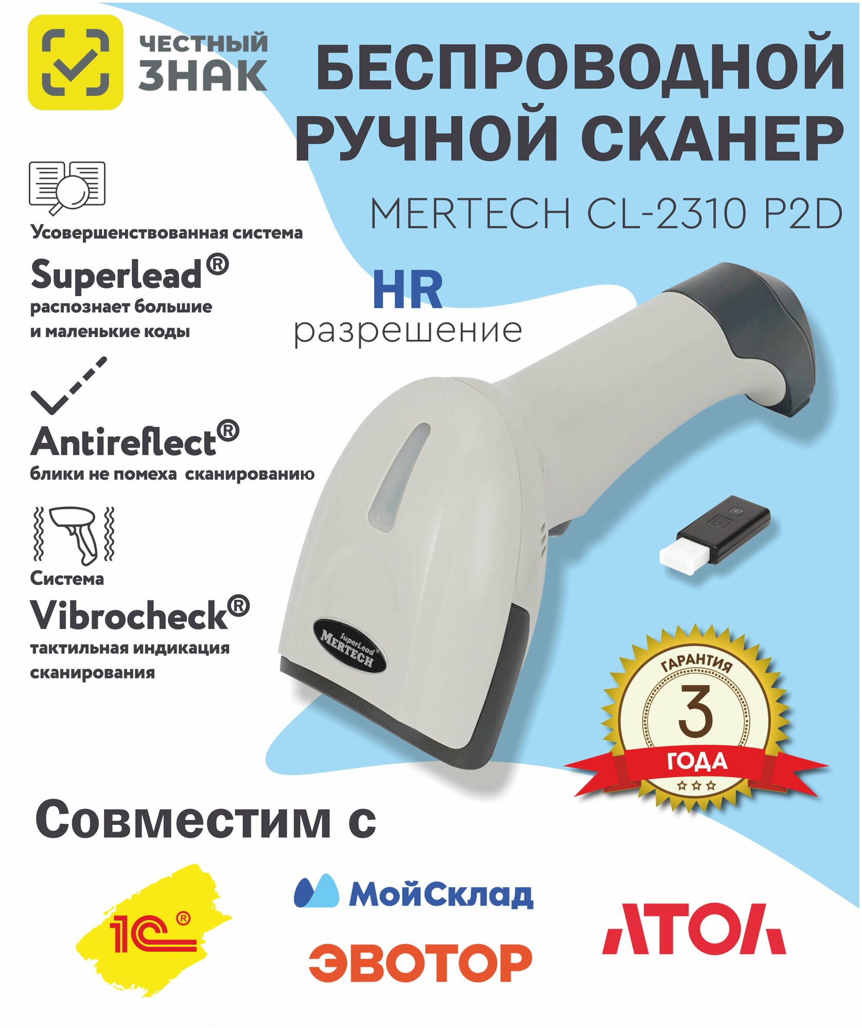 Беспроводной сканер штрих кода MERTECH CL-2310 HR P2D SUPERLEAD USB White интересное: