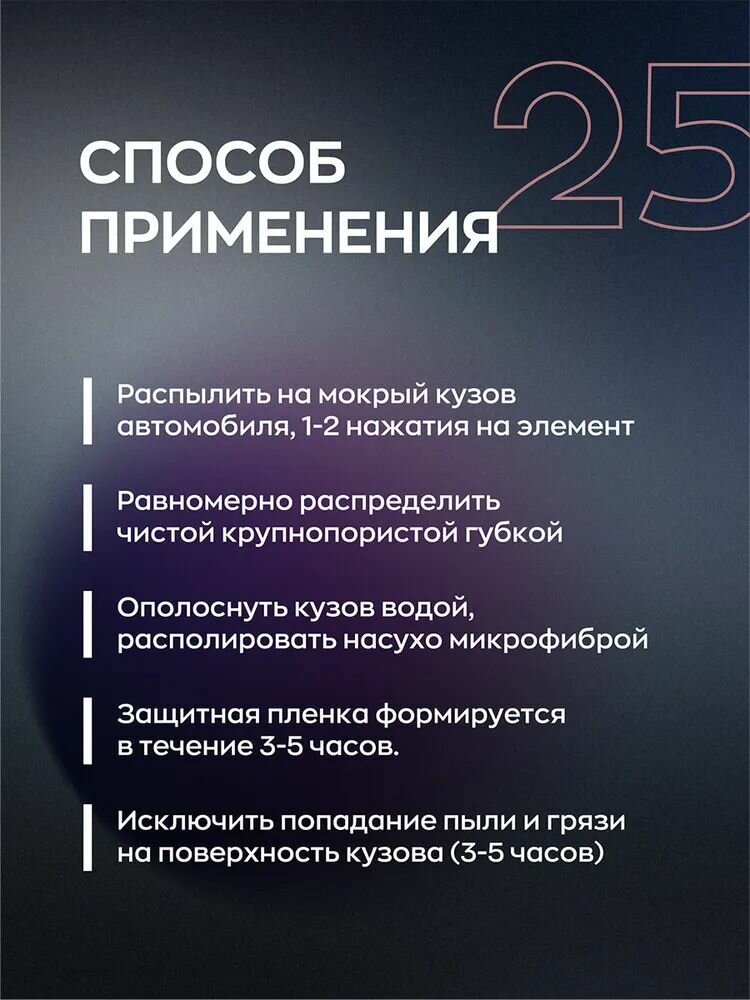 | Способ применения | Перед применением тщательно перемешать. Не наносить на недомытую поверхность! Распылить средство на мокрую чистую поверхность автомобиля при помощи триггера (1 распыление на 1 деталь), и равномерно распределить чистой крупнопористой губкой. Ополоснуть кузов водой, располировать насухо замшевой тряпкой или микрофиброй. |