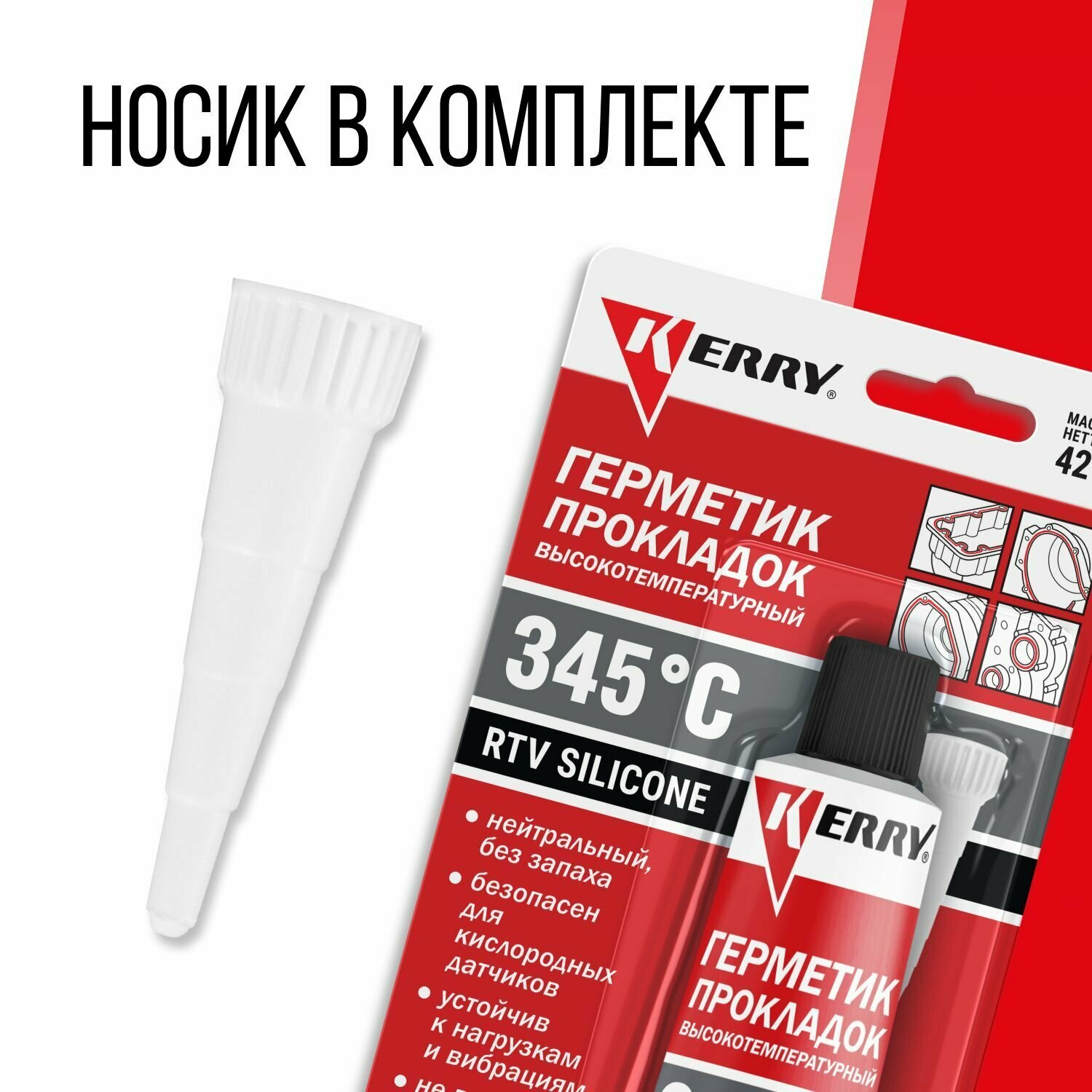 Герметик прокладок KERRY автомобильный силиконовый высокотемпературный красный, 42 грамма