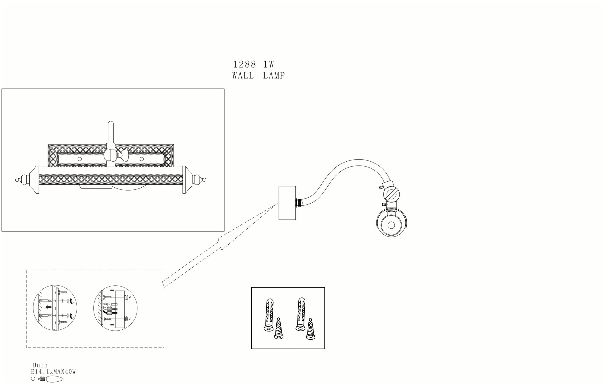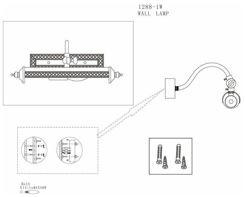 1288-1W, настенный светильник, D200xW330xH100, 1xE14x40W, excluded