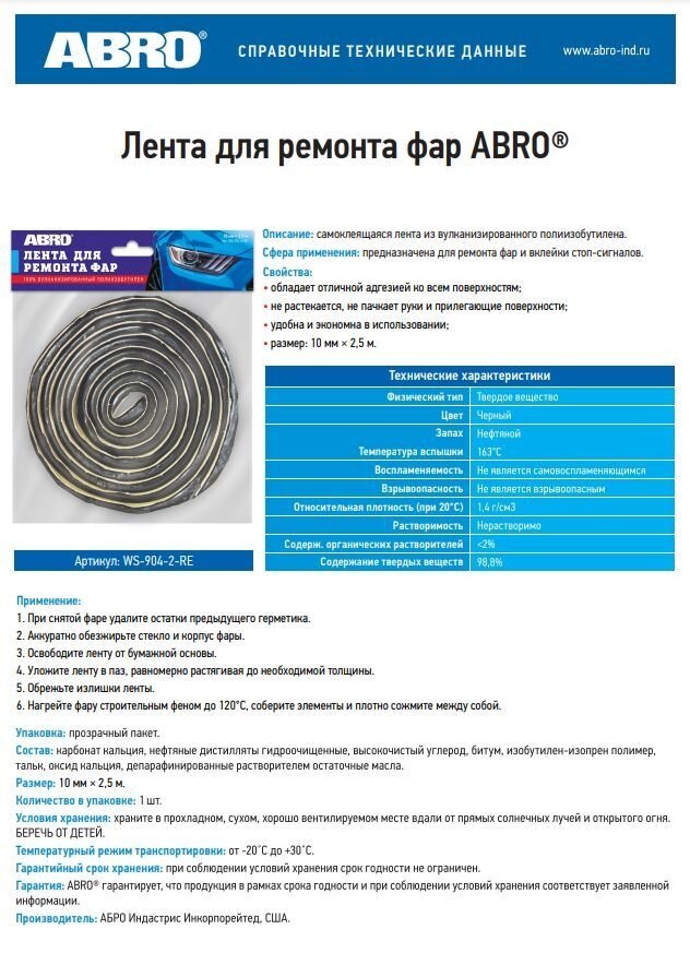Лента для ремонта фар ABRO (10ммх2.5м) лента-герметик валик самоклеящейся
