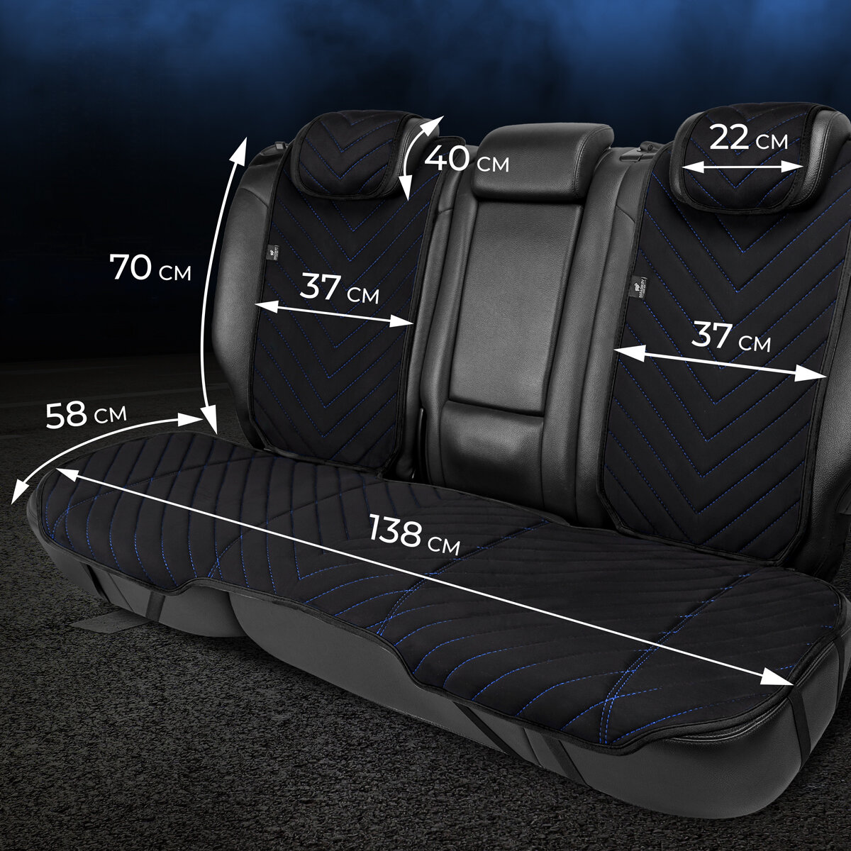 Полный комплект накидки из алькантары на сиденья автомобиля. Модель L SV PK. Чёрный/синяя строчка
