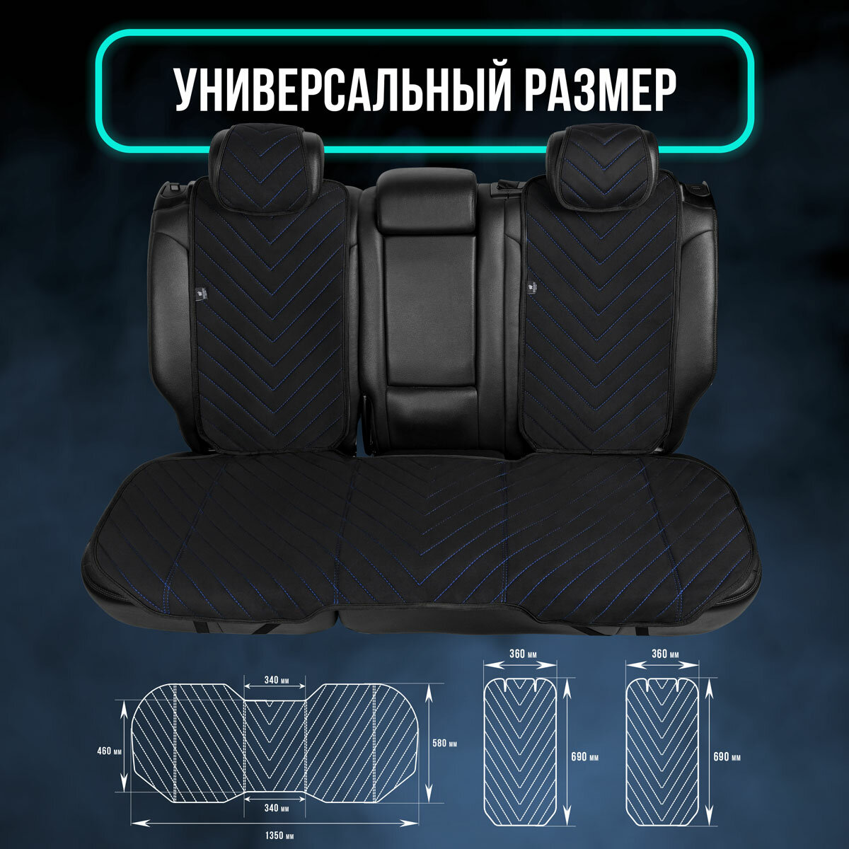 Полный комплект накидки из алькантары на сиденья автомобиля. Модель L SV PK. Чёрный/синий кант