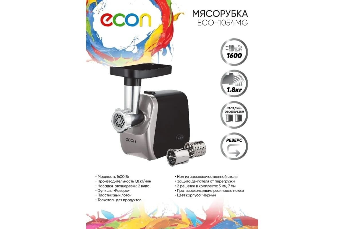 Ниже Вы можете прочитать отзывы на Мясорубка электрическая Econ ECO-1054MG, 2 насадки овощерезки + 2 решетки 5 и 7 мм, производительность 1,8 кг/ мин, реверс, 1600 Вт, ознакомится с подробными характеристиками, посмотреть интересные обзоры и фотографии на Мясорубка электрическая Econ ECO-1054MG, 2 насадки овощерезки + 2 решетки 5 и 7 мм, производительность 1,8 кг/ мин, реверс, 1600 Вт.