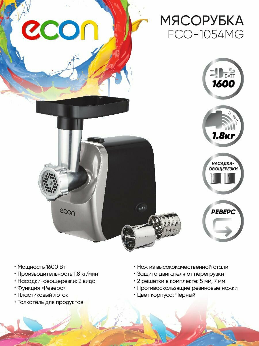 Купить Мясорубка электрическая Econ ECO-1054MG, 2 насадки овощерезки + 2 решетки 5 и 7 мм, производительность 1,8 кг/ мин, реверс, 1600 Вт