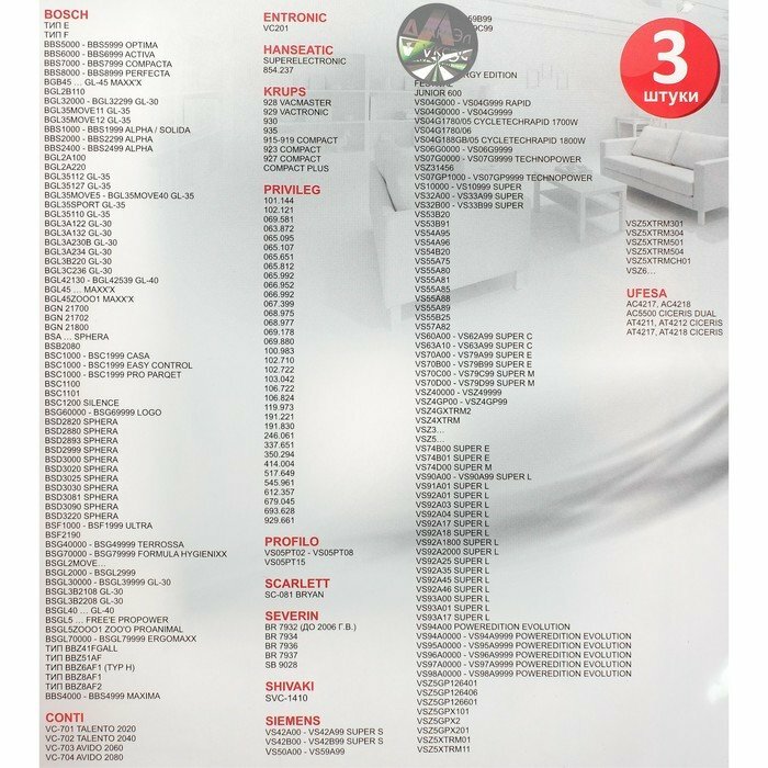 | Производитель совместимого пылесоса | Bosch, Cameron, Conti, ENTRONIC, Hanseatic, Krups, Privileg, Profilo, QUELLE, Scarlett, Severin, Shivaki, Siemens, Ufesa |