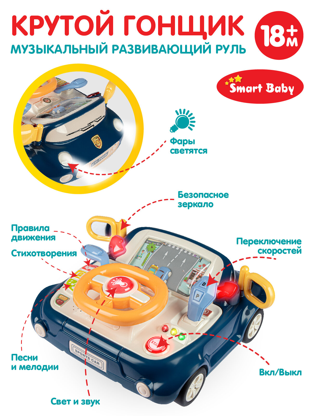 Музыкальный развивающий руль "Крутой гонщик" ТМ Smart Baby с голосовым помощником, мелодий В. Шаинского, свет, звук, JB0334019