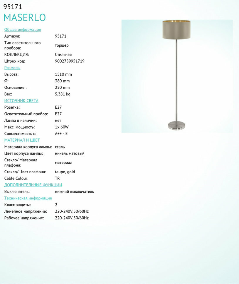 Ниже Вы можете прочитать отзывы на Торшер Eglo Maserlo 95171, ознакомится с подробными характеристиками, посмотреть интересные обзоры и фотографии на Торшер Eglo Maserlo 95171.