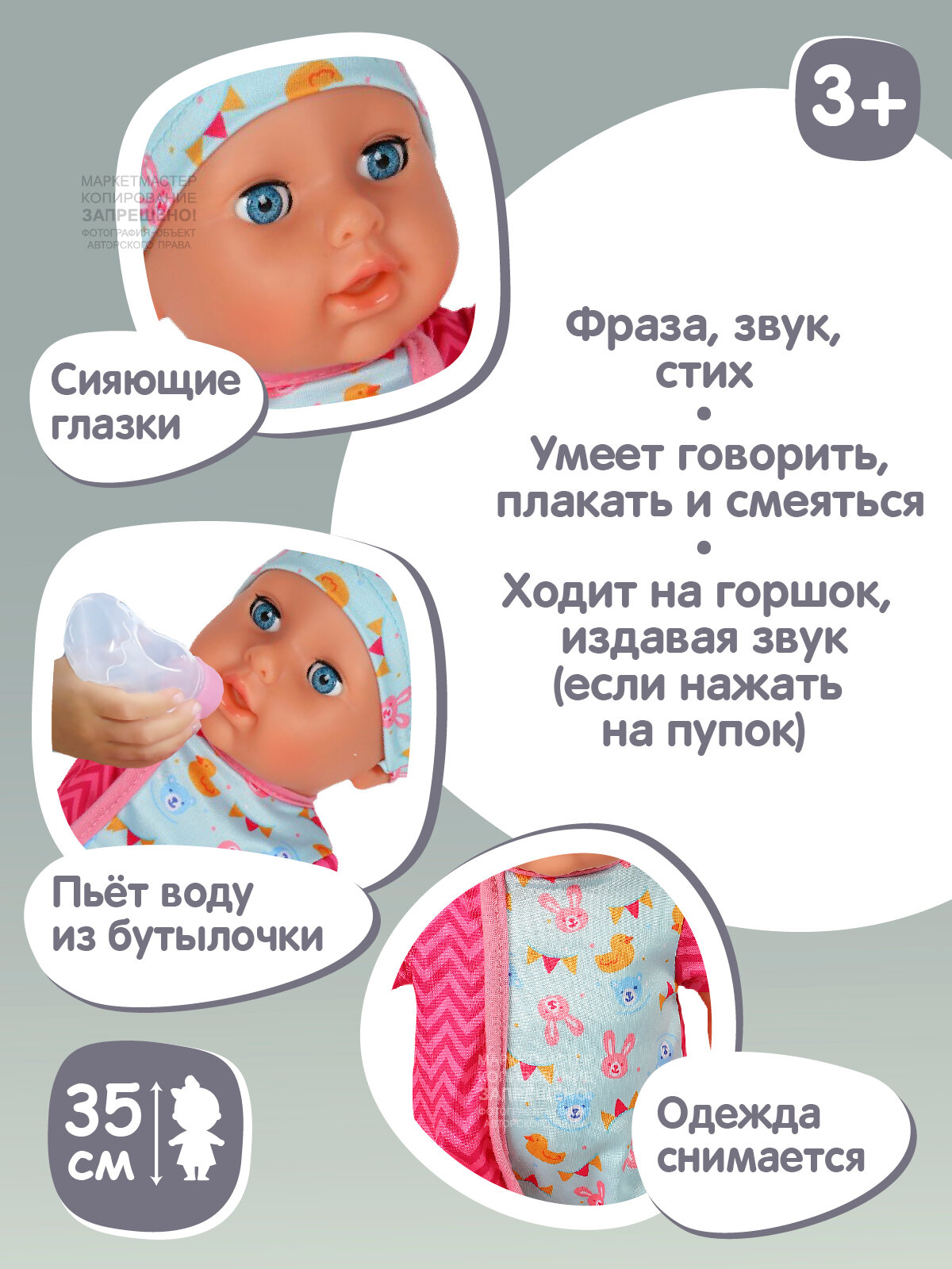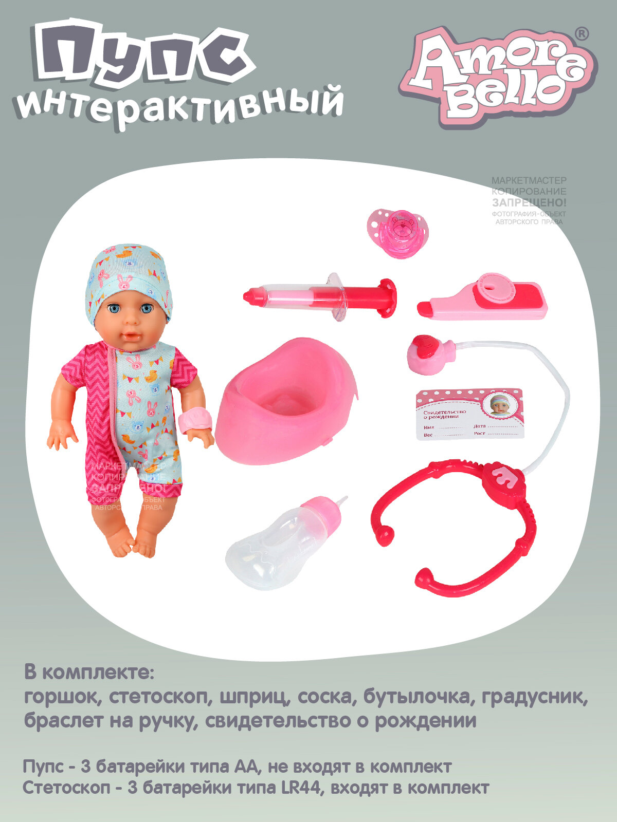 | Комплектация | кукла, горшок, стетоскоп, шприц, соска, бутылочка, градусник, браслет на ручку |