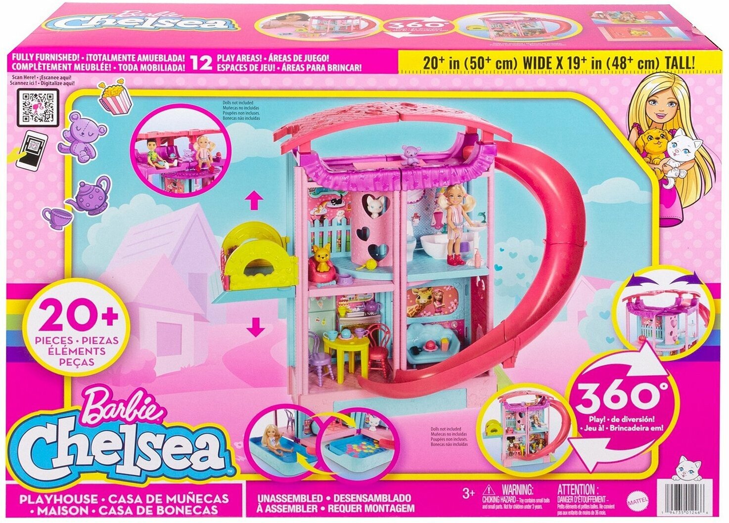 Barbie HCK77 Chelsea Playhouse (прибл. 51 см) Трансформируемый игровой домик с горкой, бассейном, бассейном с шариками, щенком и котятами, лифтом, более 15 аксессуарами, подарок для детей от 3 лет интересное: