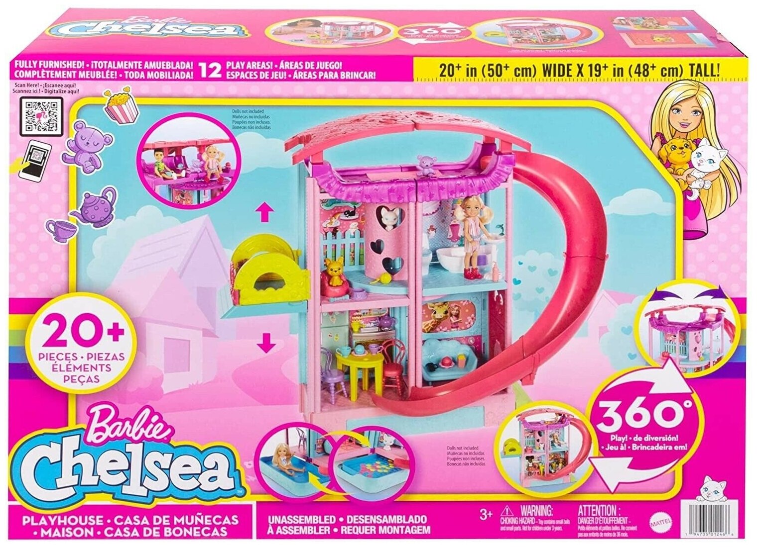 Купить Barbie HCK77 Chelsea Playhouse (прибл. 51 см) Трансформируемый игровой домик с горкой, бассейном, бассейном с шариками, щенком и котятами, лифтом, более 15 аксессуарами, подарок для детей от 3 лет