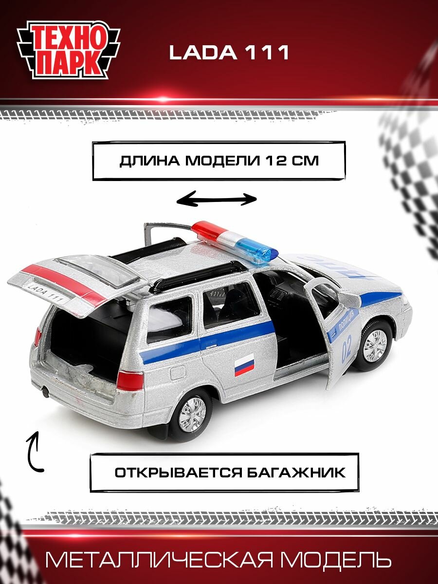 Машинка детская Лада 111 ВАЗ 2111 Полиция 12 см, Технопарк, серебристая, открываются двери и багажник, металлическая