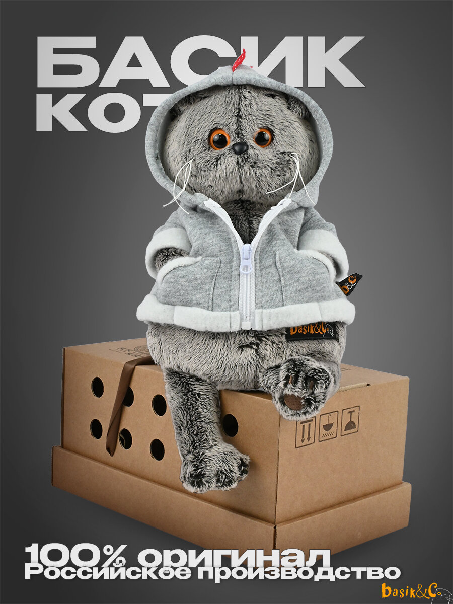Мягкая игрушка Basik&Co Кот Басик в толстовке Дракончик, 25 см, серый, BUDIBASA