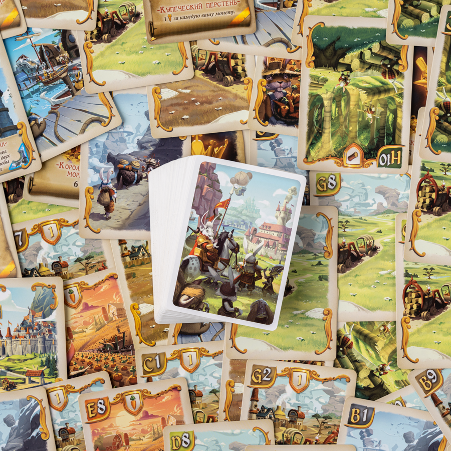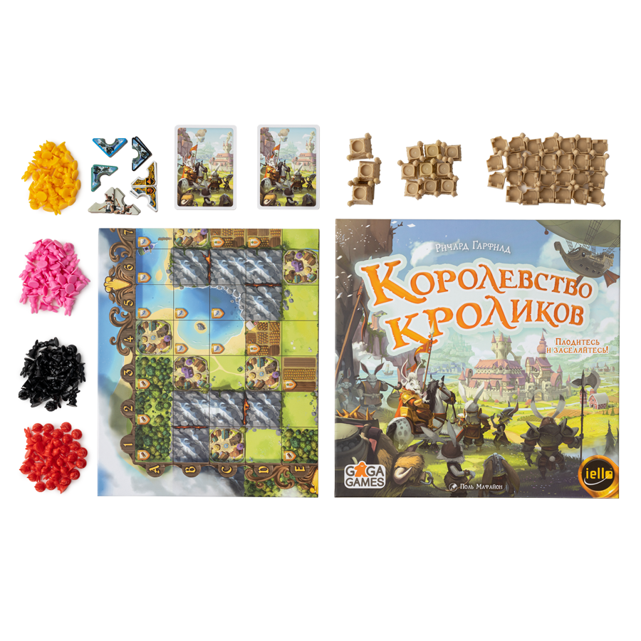 | Комплектация | Игровое поле, 144 фигурки кроликов, 39 фигурок городов, 24 жетона построек, 182 карты исследования, 4 карты-памятки, Правила игры |