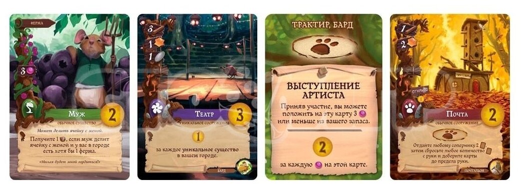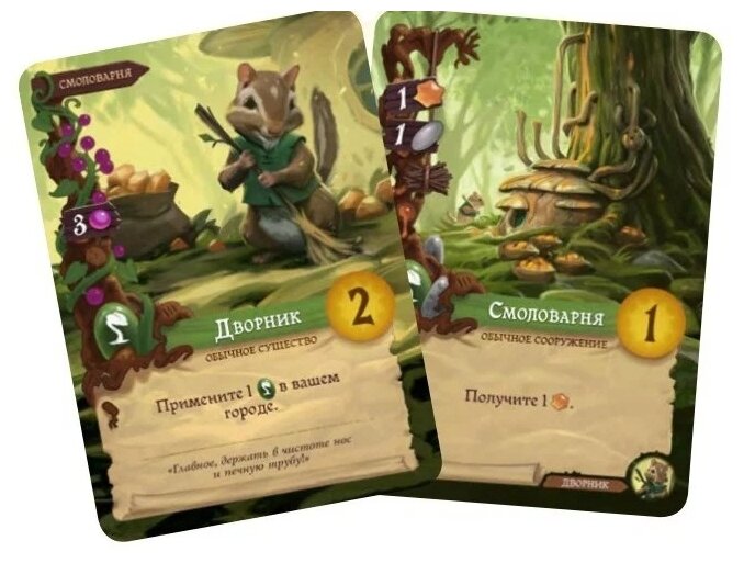 | Комплектация | -восьмигранный кубик,игровое поле, вечное древо, 128 карт с красочными иллюстрациями, 105 фишек ресурсов: ягод, веток, смолы и камушков, 24 фишки работников, 4 жетона событий, 27 мини-карт, 30 жетонов победных очков, 20 жетонов закрытых дверей |