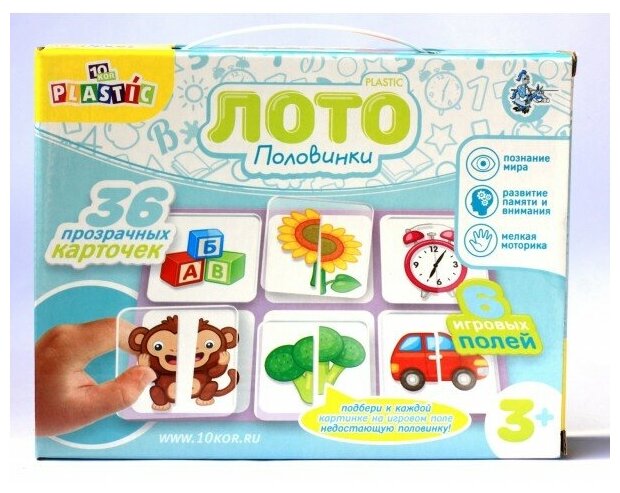Детское пластиковое лото "Половинки", настольная развивающая игра-головоломка для детей, 36 разрезных прозрачных картинок-половинок + 6 полей интересное: