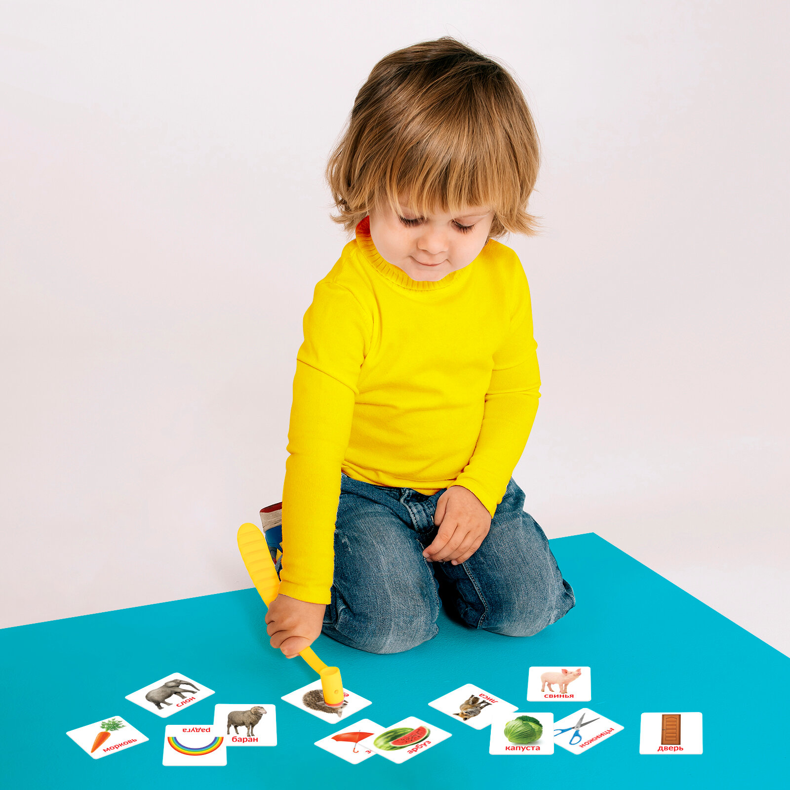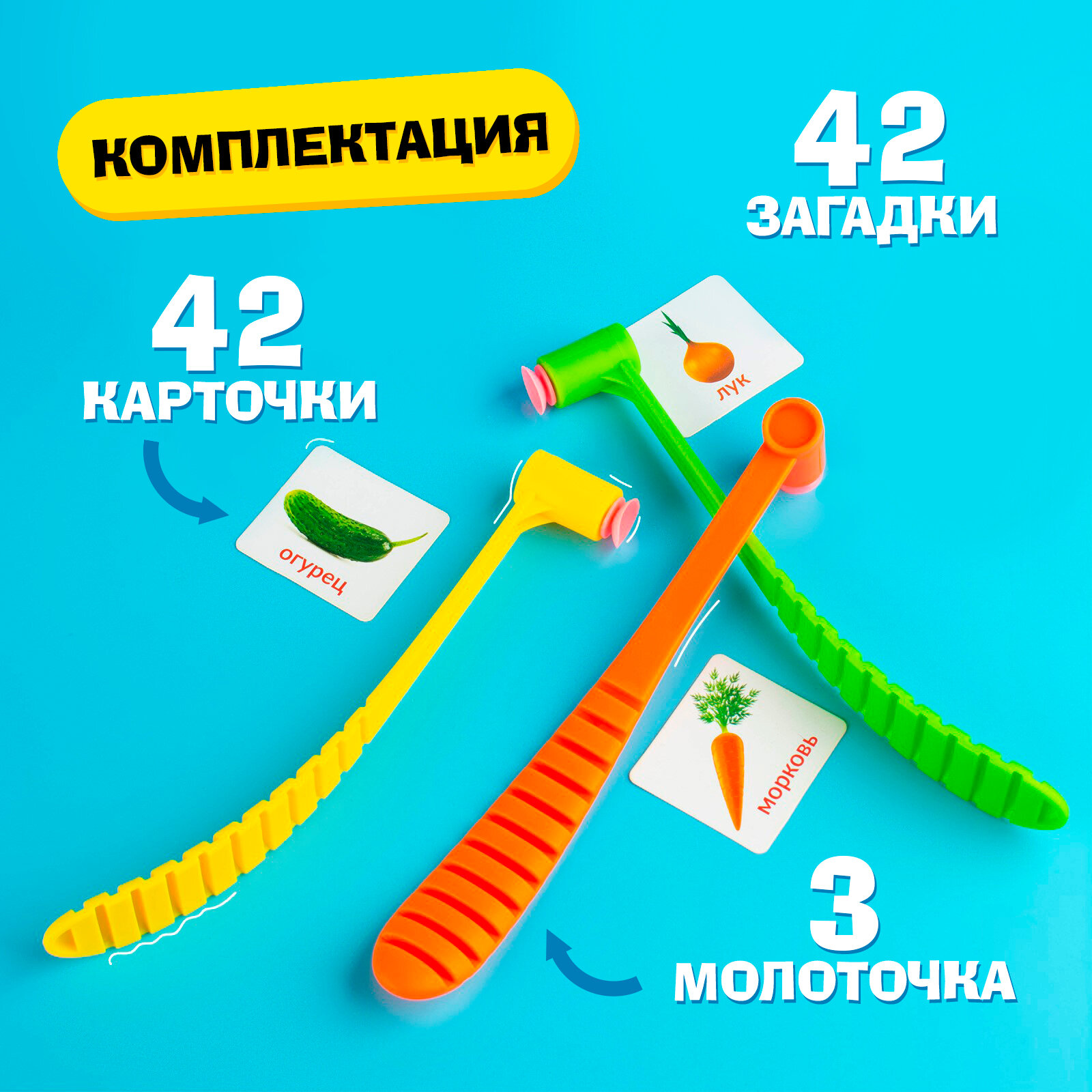 | Комплектация | 42 игровые карточки; лист с загадками (животные, предметы, овощи); 3 молоточка. |