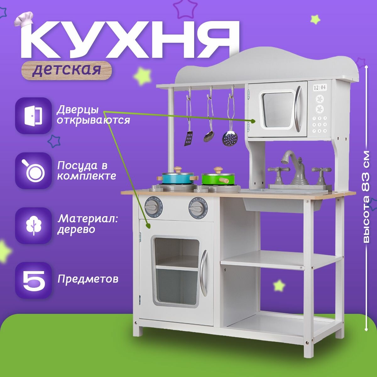 Кухня детская игровая, деревянная 83см с аксессуарами, белая интересное: