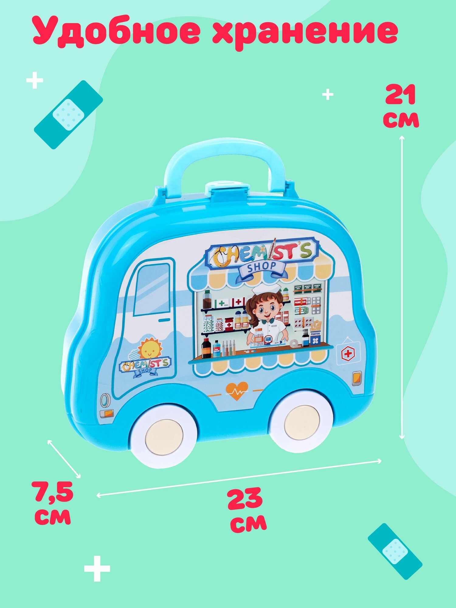| Комплектация | фонендоскоп, ножницы, шприц, ложечка, пробирка, 2 баночки, монитор, весы, бейджик, шапочка доктора |