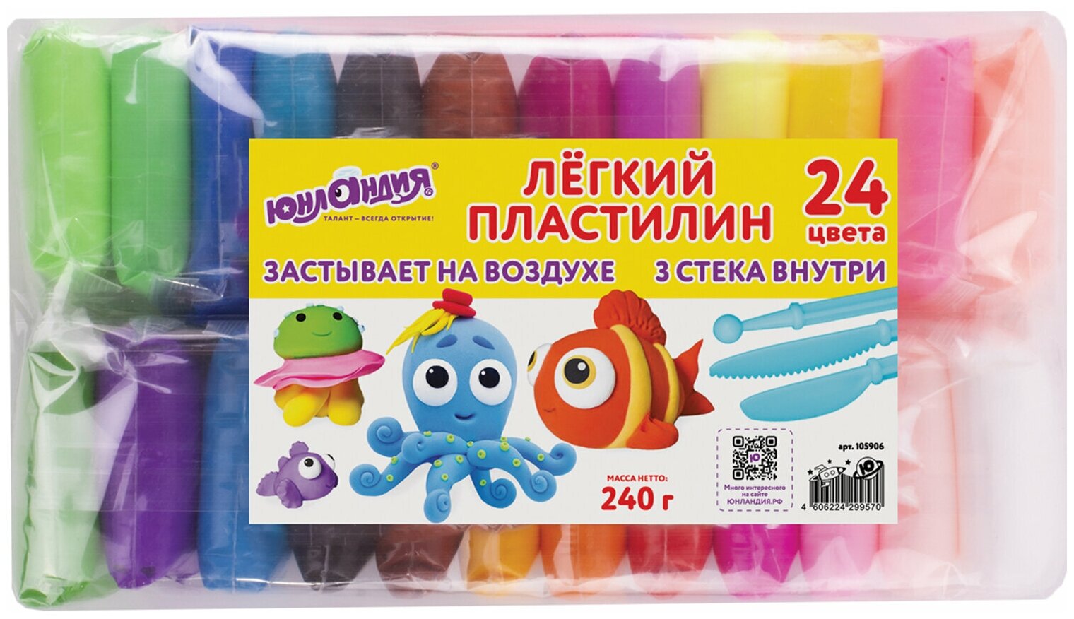 Пластилин супер лёгкий воздушный застывающий 24 цвета, 240 г, 3 стека, юнландия, 105906 интересное: