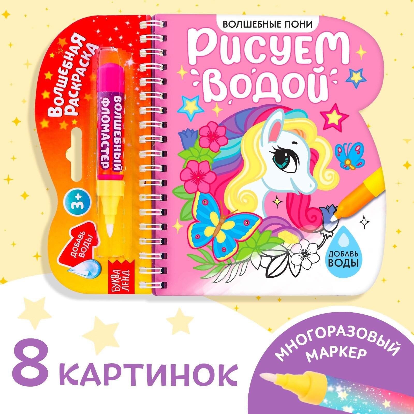 Книжка для рисования водой "Волшебные пони" многоразовая, с маркером, буква-ленд