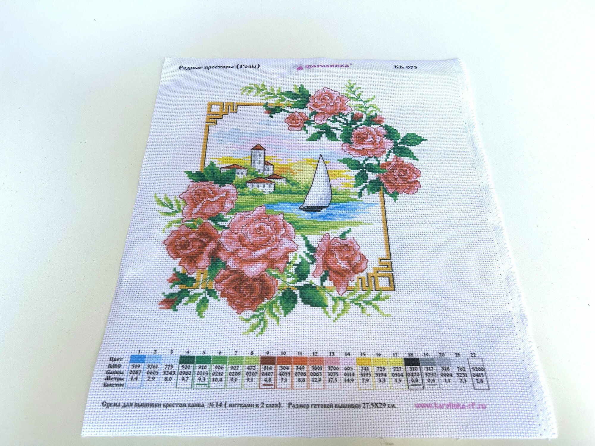 | Комплектация | канва с нанесенным рисунком Aida 14 ct ,иголка,нитки мулине х/б, цветная символьная схема,инструкция |