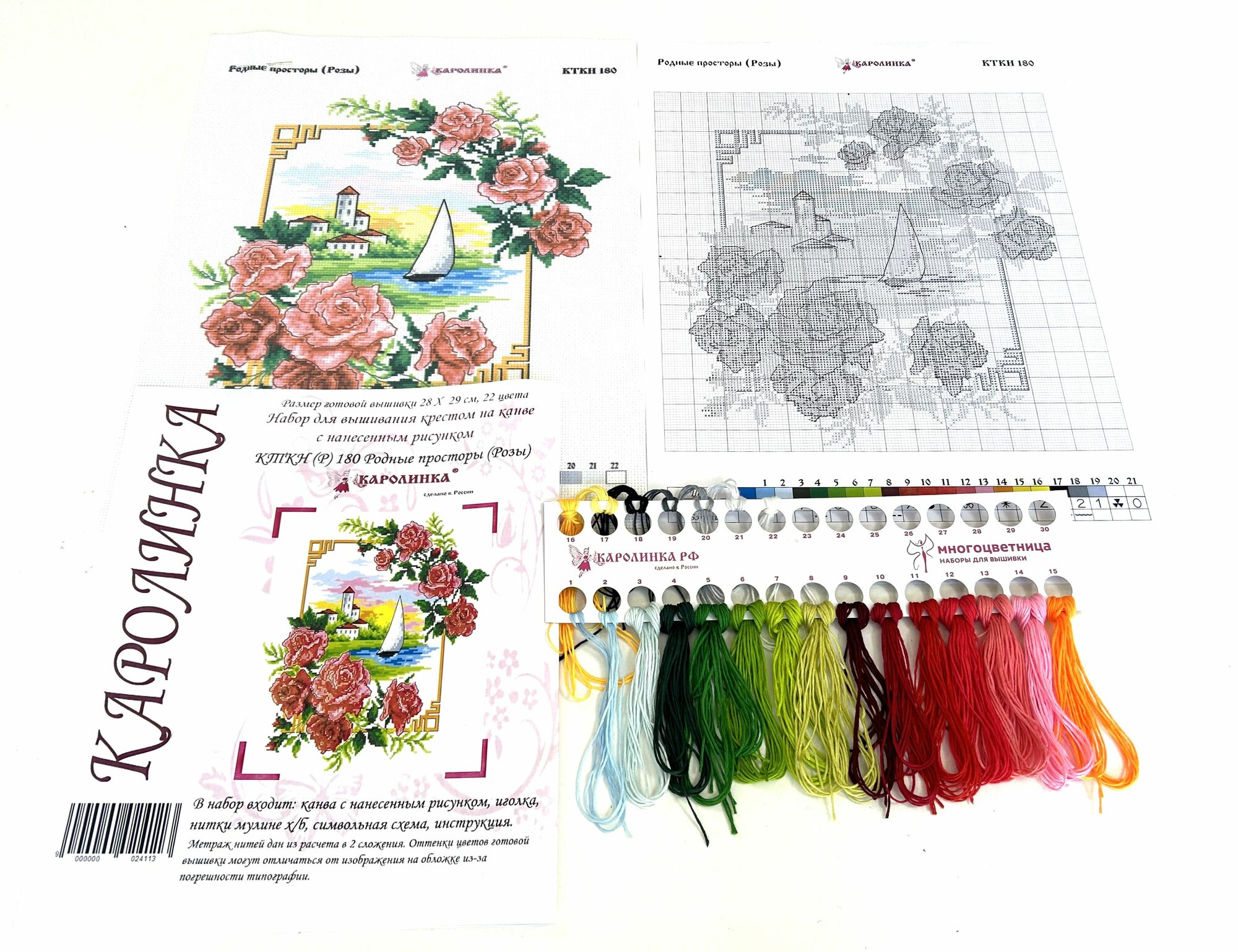 | Комплектация | канва с нанесенным рисунком Aida 14 ct ,иголка,нитки мулине х/б, цветная символьная схема,инструкция |