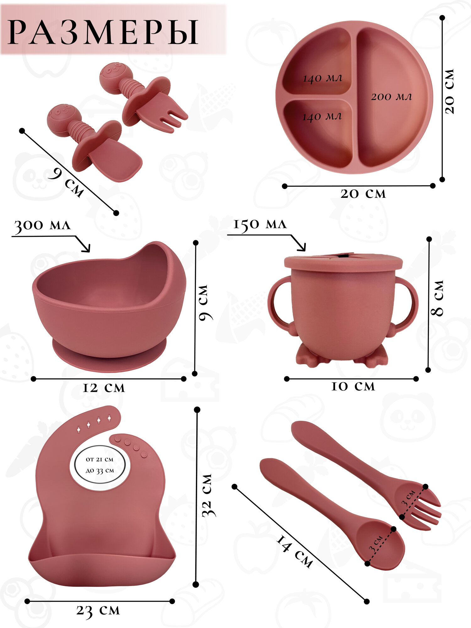 | Комплектация | Нагрудник с кармашком для улавливания пищи. • Умная тарелка на присоске. • Безопасные вилка и ложка. • Тарелка с разделением еды по секциям. • Детские вилка и ложка. • Непроливаемый стакан с 2 разными крышками, трубочкой и нескользящим дном. |
