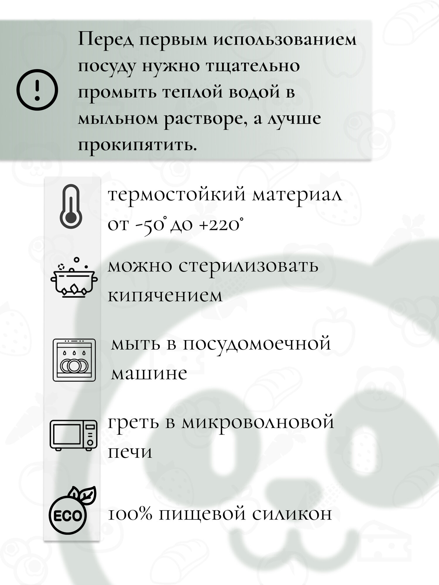 | Особенности | использование в СВЧ / можно мыть в посудомоечной машине / можно стерилизовать / на присоске / тарелка с секциями |