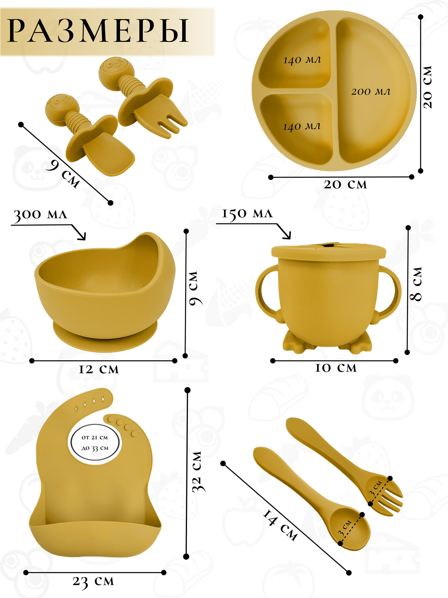 | Комплектация | Нагрудник с кармашком для улавливания пищи. • Умная тарелка на присоске. • Безопасные вилка и ложка. • Тарелка с разделением еды по секциям. • Детские вилка и ложка. • Непроливаемый стакан с 2 разными крышками, трубочкой и нескользящим дном. |