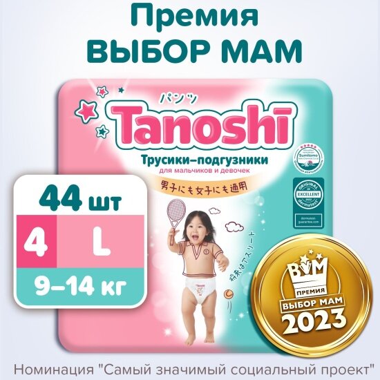 Tanoshi Трусики-подгузники для детей, размер L 9-14 кг, 44 шт.