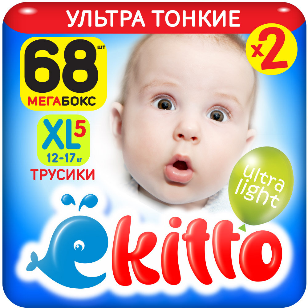 Подгузники трусики детские Ekitto Ultra Light 5 размер XL для детей от 12-17 кг, ультратонкие ночные памперсы трусы для мальчиков и девочек, японские премиум, 102 шт