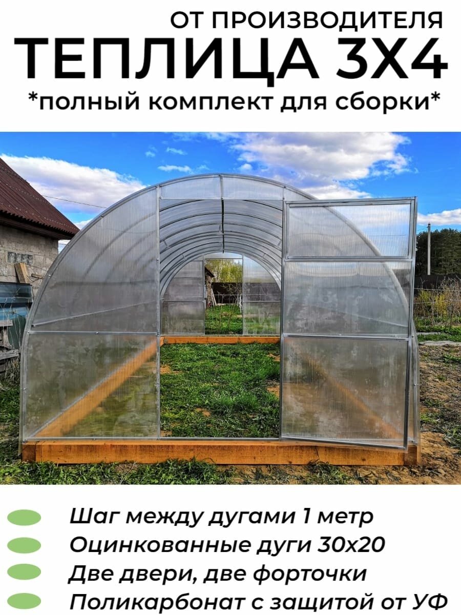 Купить Теплица/шаг 1 м Арочная (Поликарбонат в комплекте), оцинкованный каркас дуги из профиля 30*20 мм, полный комплект для сборки. 3х4х2.02 м