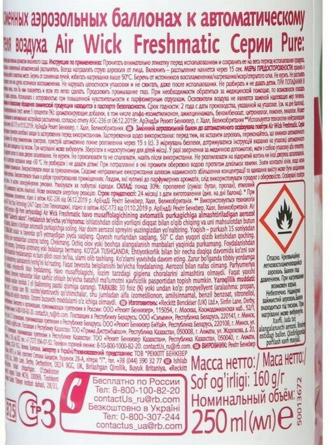 | Дополнительная информация | баллон для автоматического освежителя воздуха Air Wick Freshmatic, перед тем, как вставить аэрозоль, проверьте, что диспенсер выключен, не направляйте в лицо при включении или при установке интервала распыления, после включения распыление начнется автоматически через 15 сек |