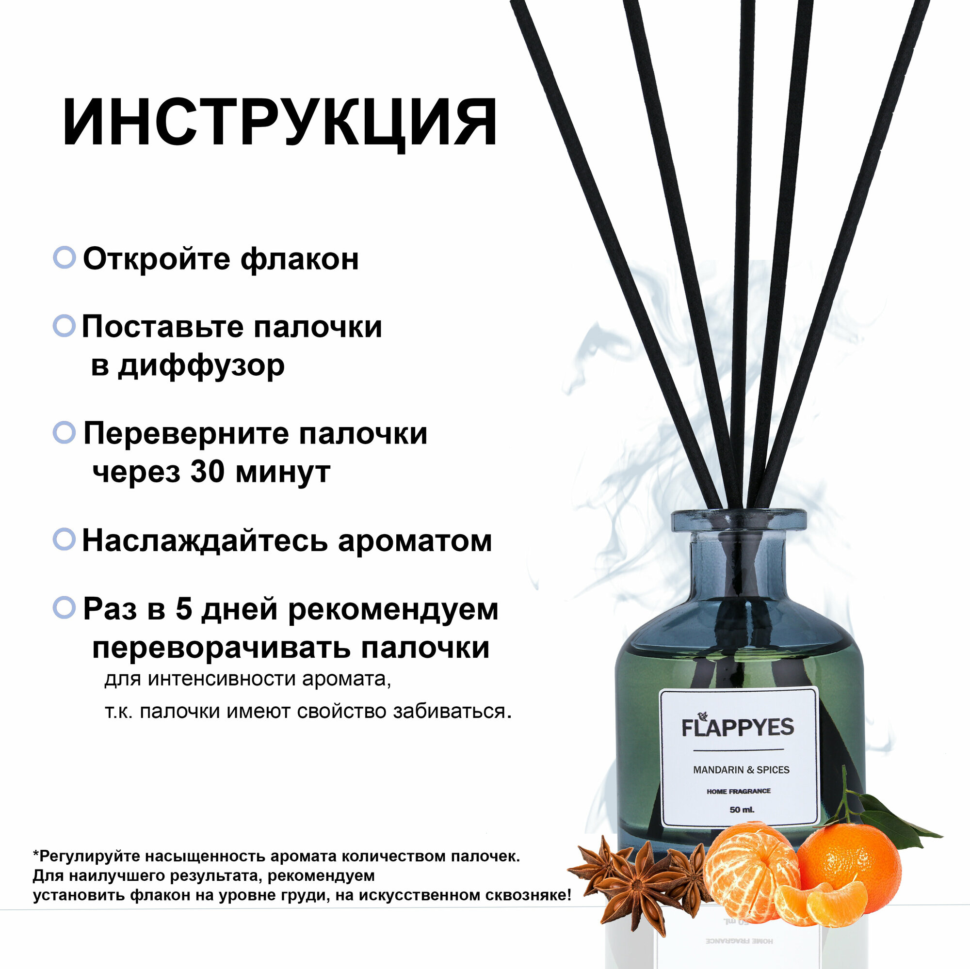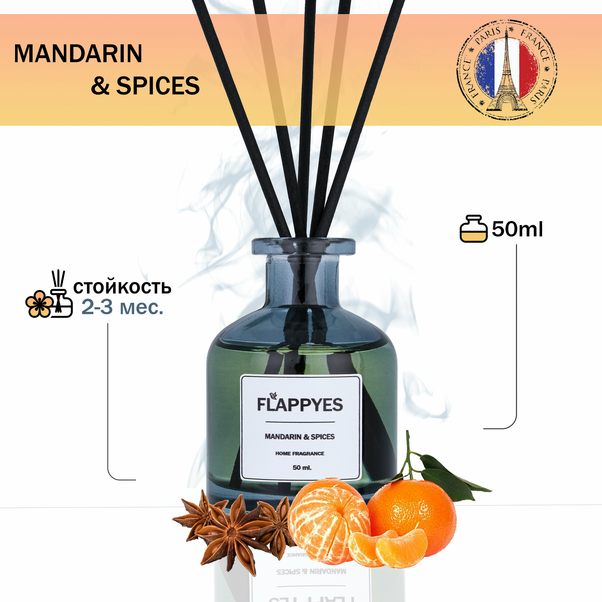 Купить Ароматический диффузор с палочками для дома "Flappyes - Мандарин со специями" / Ароматизатор для дома / аромадиффузор