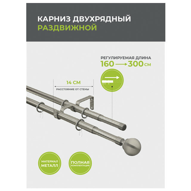Карниз настенный металлический двухрядный раздвижной 160-300 см d20 мм хром матовый
