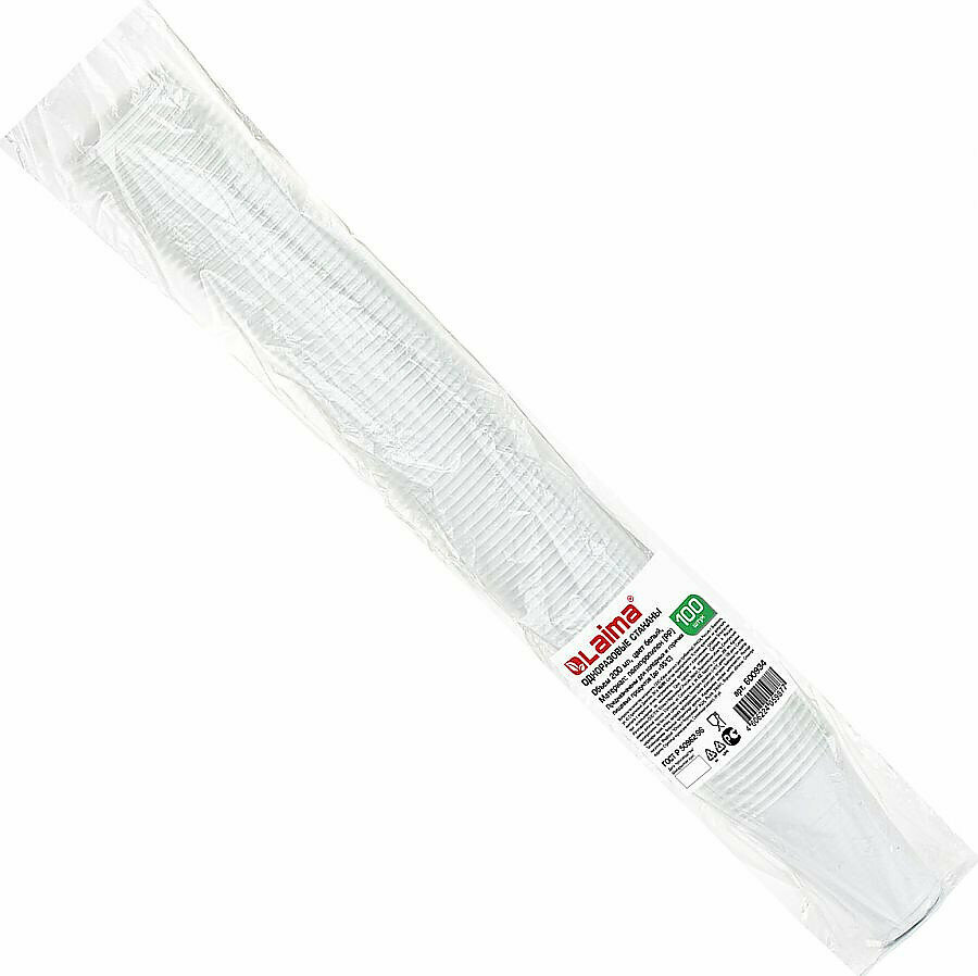 Одноразовые стаканы 200 мл, комплект 100 шт., пластиковые, "бюджет", белые, ПП, холодное/горячее, LAIMA, 600934