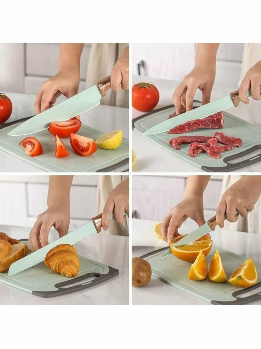 | Комплектация | Щипцы кухонные, лопатка кондитерская и лопаточка с отверстиями для жарки на сковороде, ложка для спагетти, ложка для салата, ложка для выпечки, шпатель, половник, шумовка, венчик для взбивания, кисточка для масла, 5 ножей разного размера, разделочная доска и подставка для хранения приборов. |