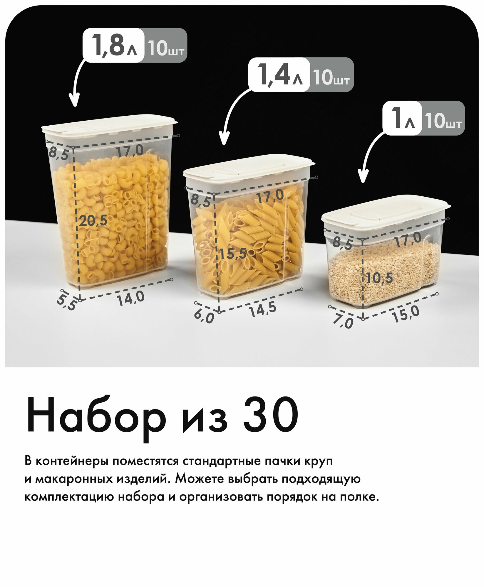 Купить Набор контейнеров для сыпучих продуктов №14 (1лх10шт; 1,4лх10шт; 1,8лх10шт) (слоновая кость)