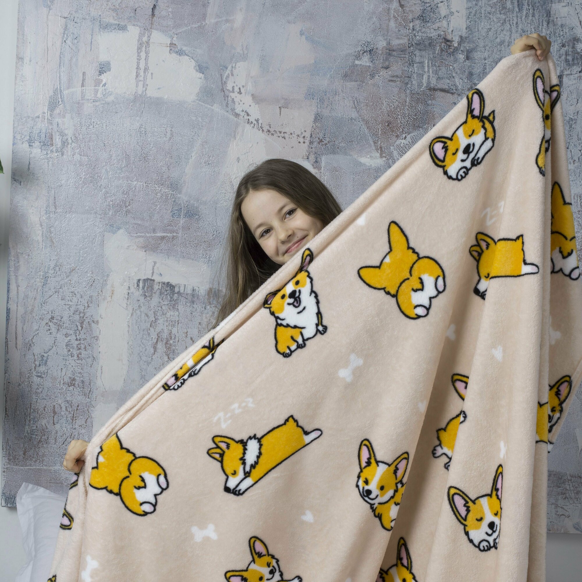 Детский плед из микрофибры, 100 х 150 см, рисунок собачки корги, светло-серый