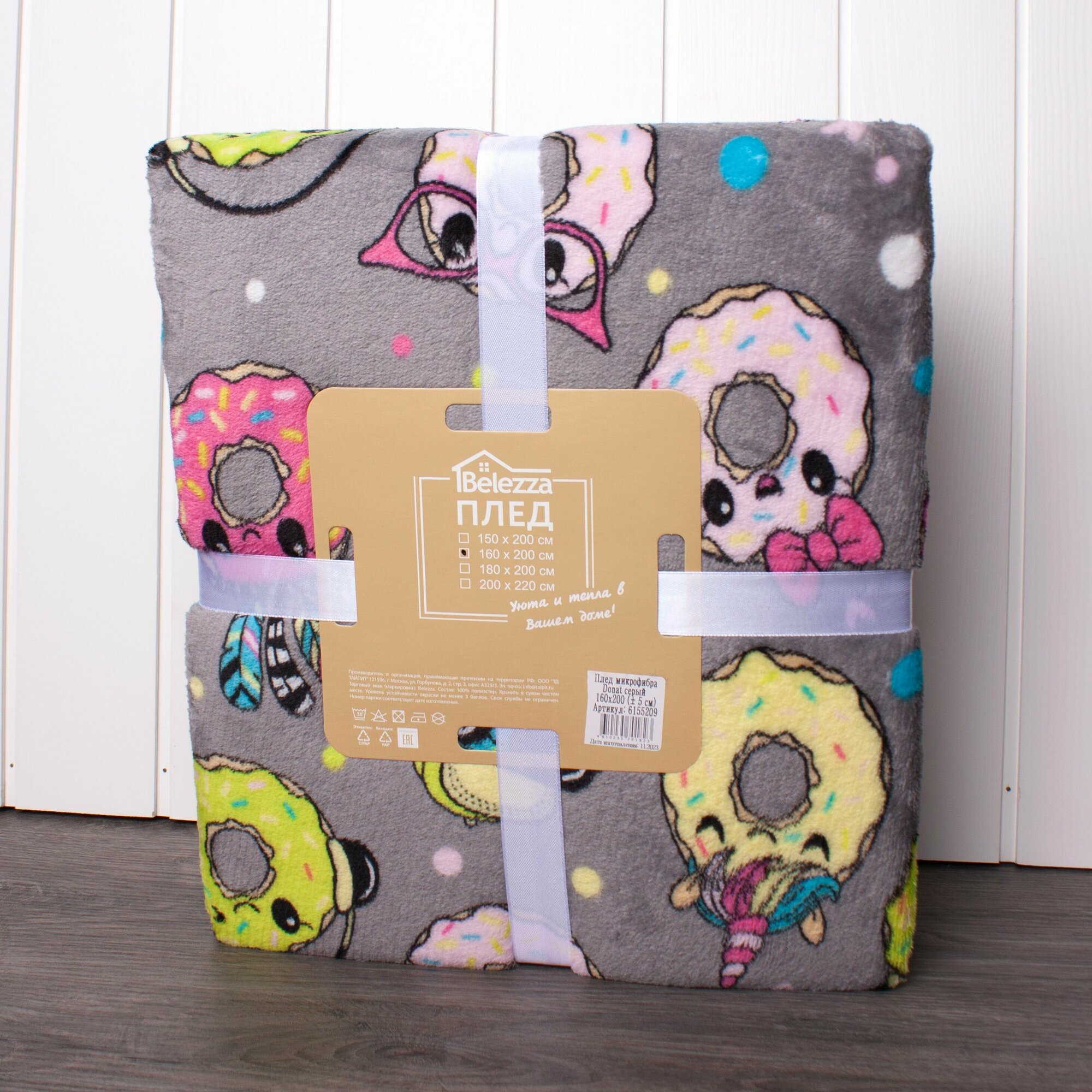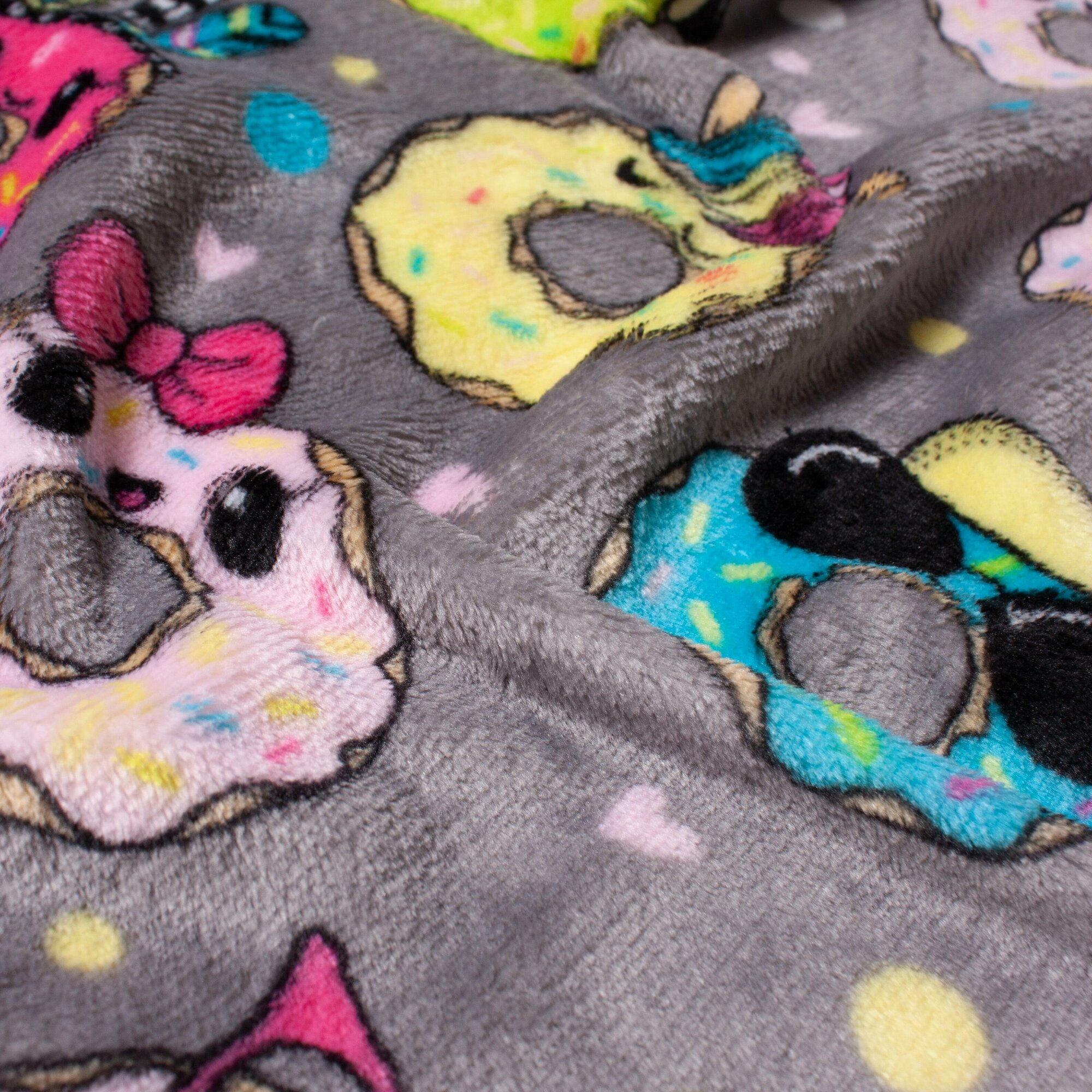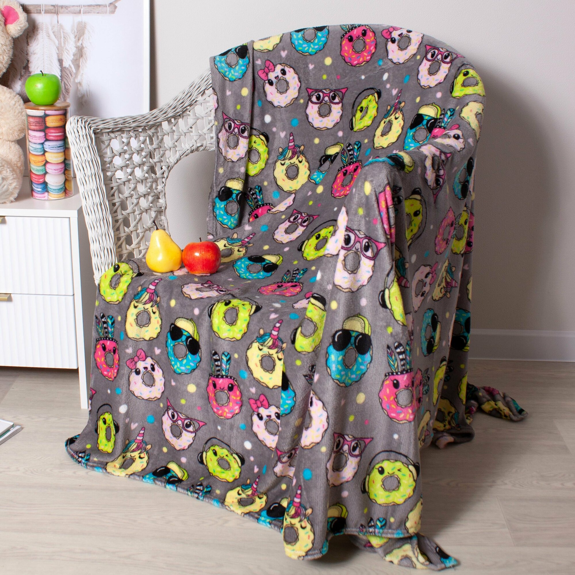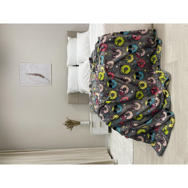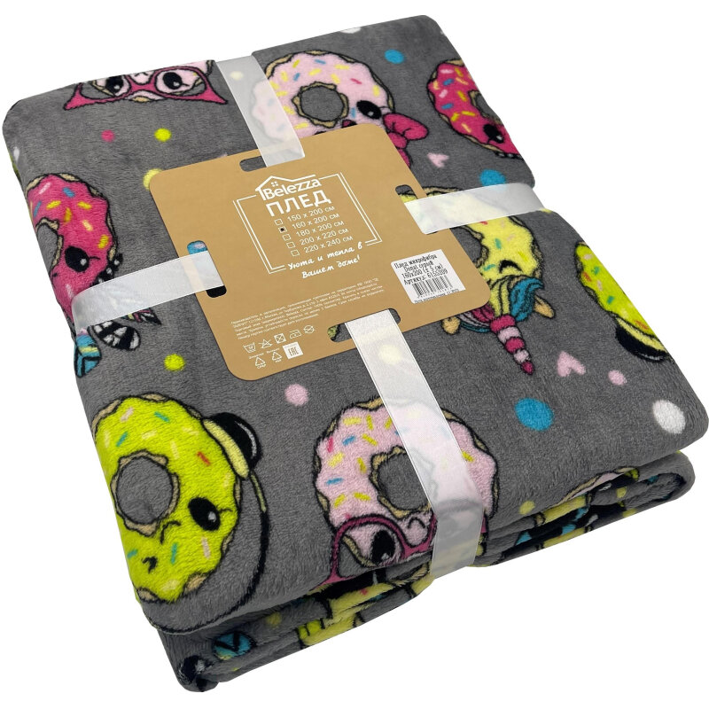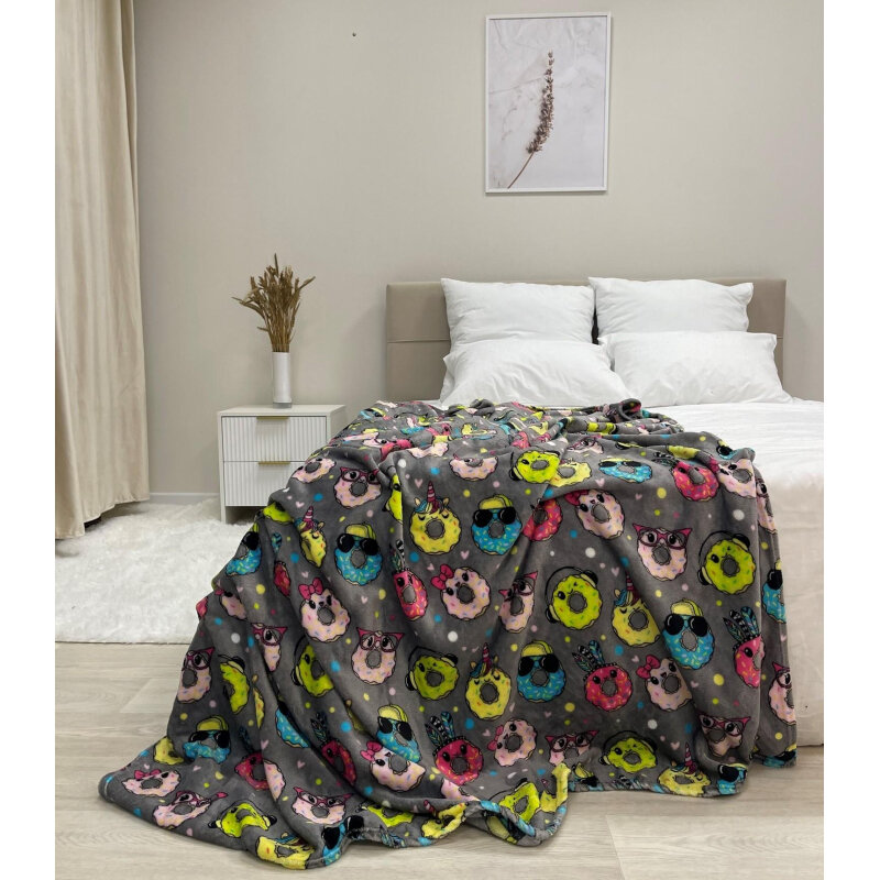 Купить Плед велсофт 160х200 см с принтом, Фестиваль, пончики / серый