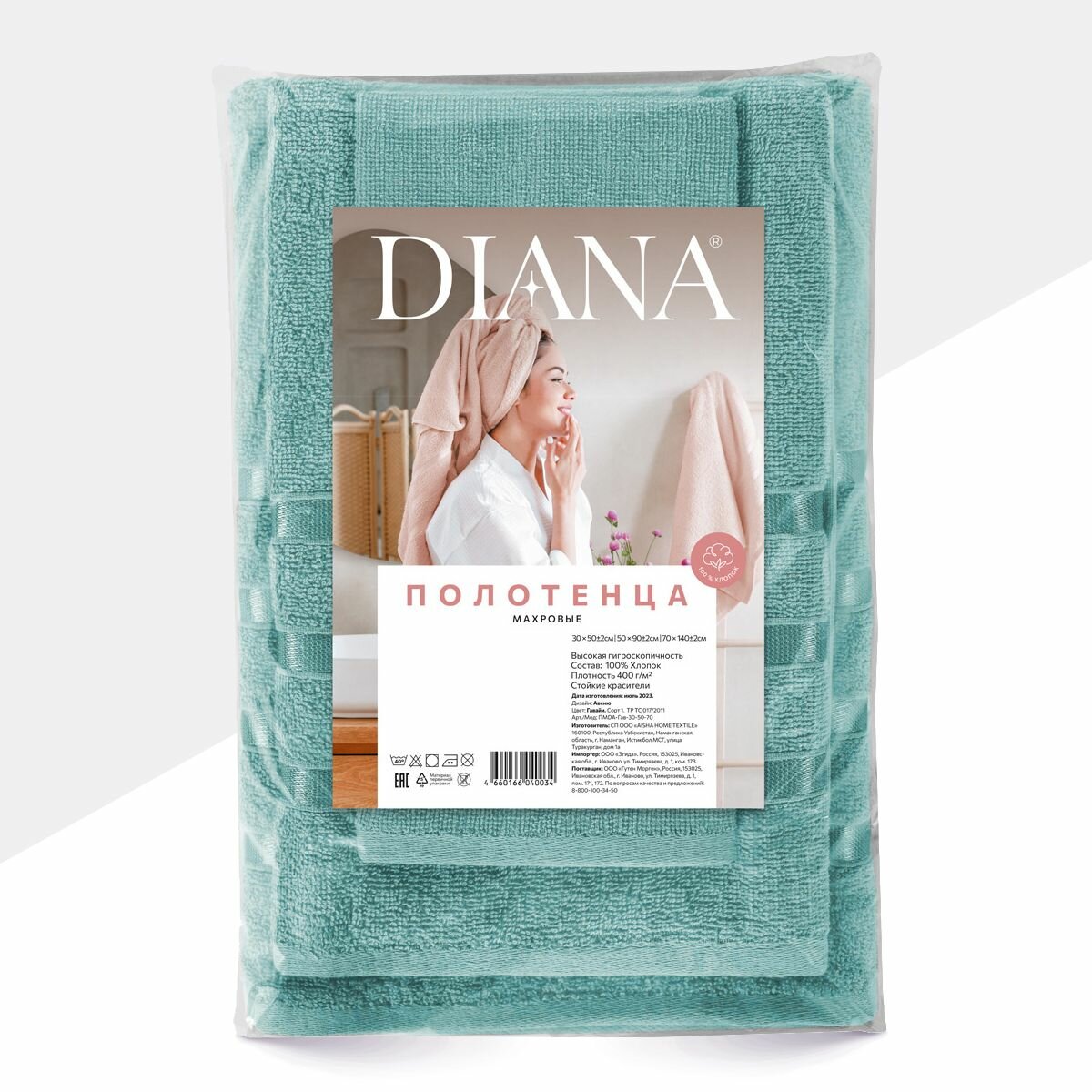 Набор полотенец махровых Diana, Авеню, 3 шт 30х50, 50х90, 70х140, 100% хлопок, Турмалин