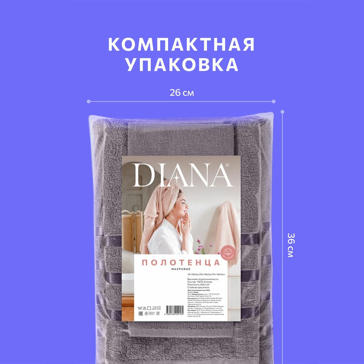Полотенце махровое 3 шт, 30х50, 50х90, 70х140, Diana, Нуар, цвет: Гиацинт