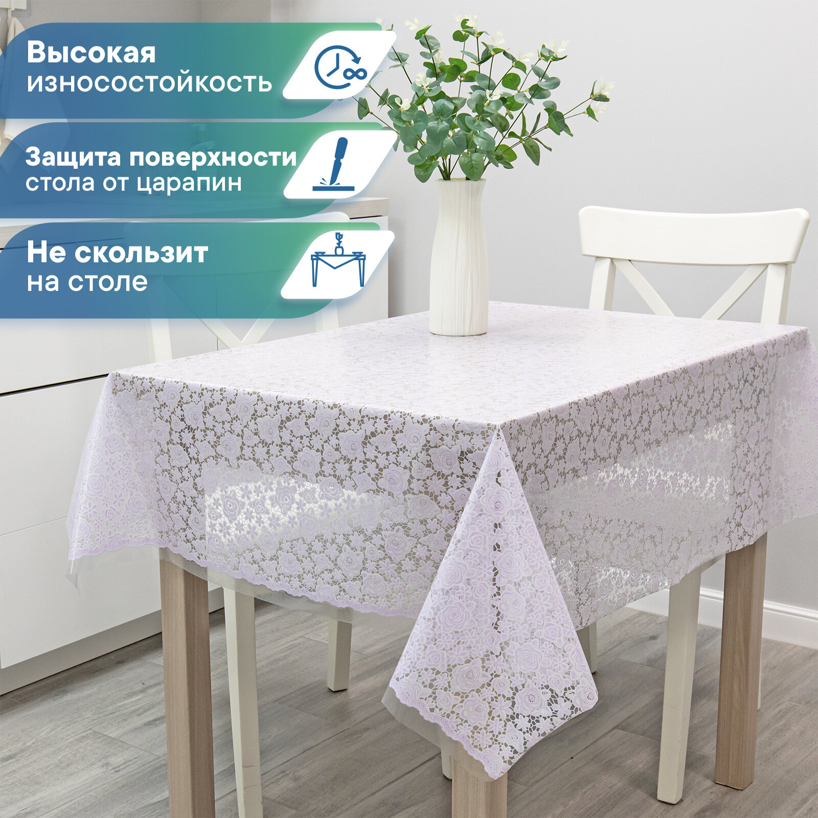 Скатерть клеенка прямоугольная VILINA "Элегия" водонепроницаемая на стол для кухни135х228 см белая прозрачная 014-white