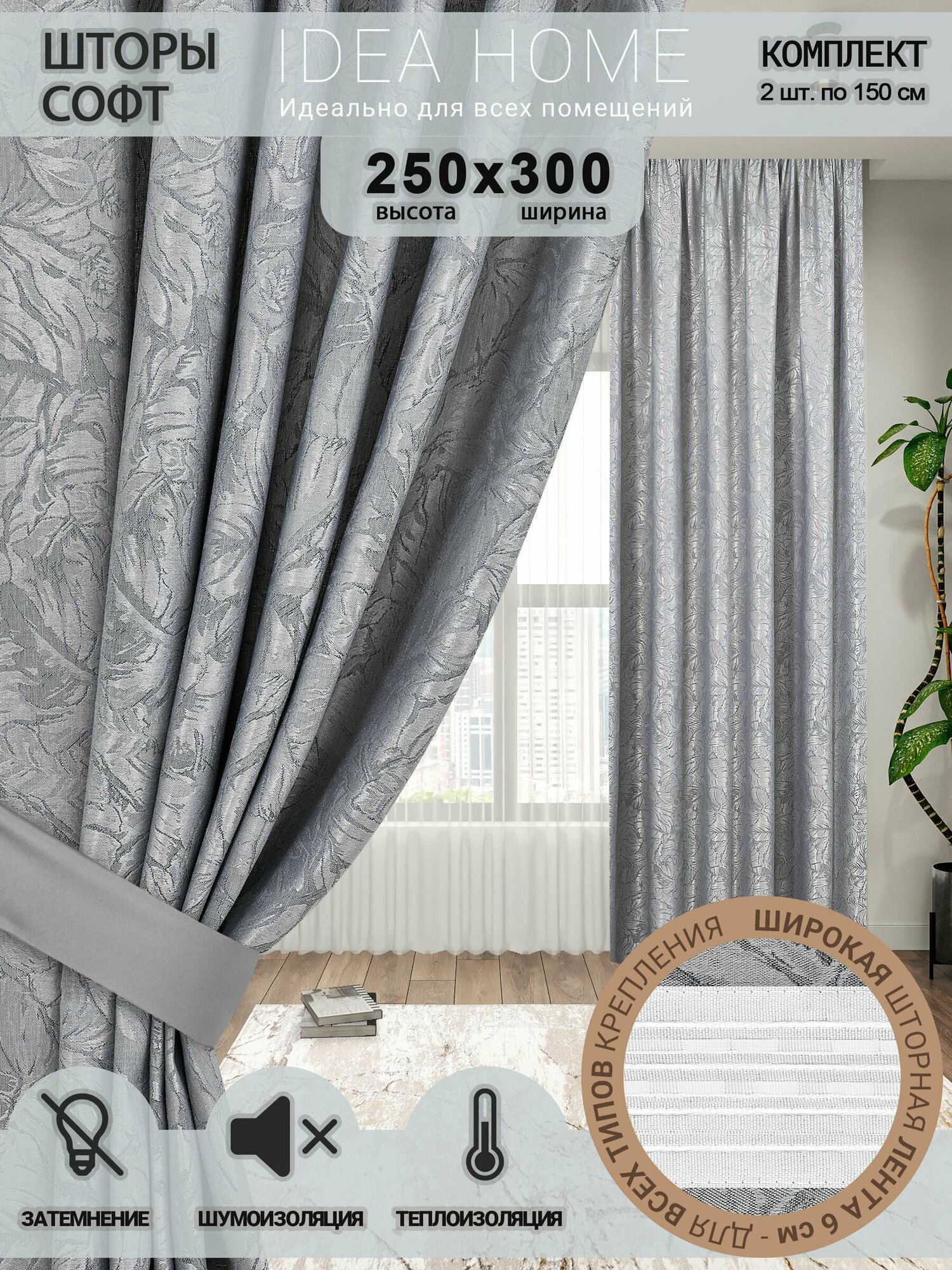 СохранитьКомплект штор из 2 шт по 150 cм / IDEA HOME светозащитные для комнаты, кухни, спальни, гостиной и дачи 300*250 см , софт, серый интересное: