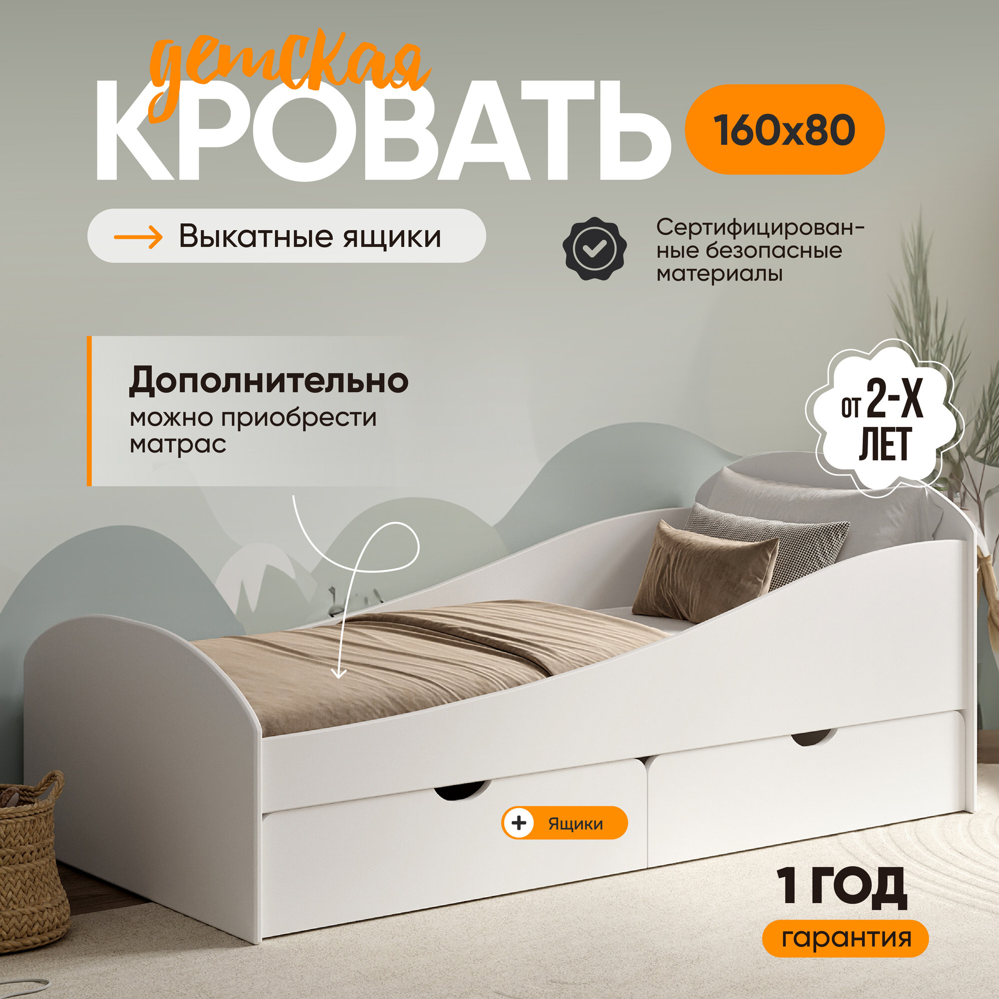 Кровать детская от 2 лет 160х80 см с 2 ящиками, цвет Белый, с защитными бортиками, кровать односпальная подростковая, тахта кровать
