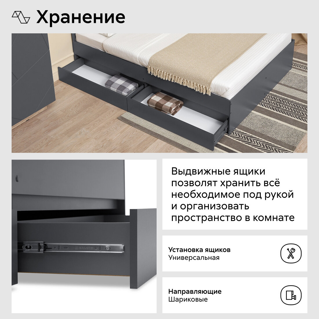 Кровать двуспальная с ящиками Нонтон Скайвуд, 160*200 см, графит серый