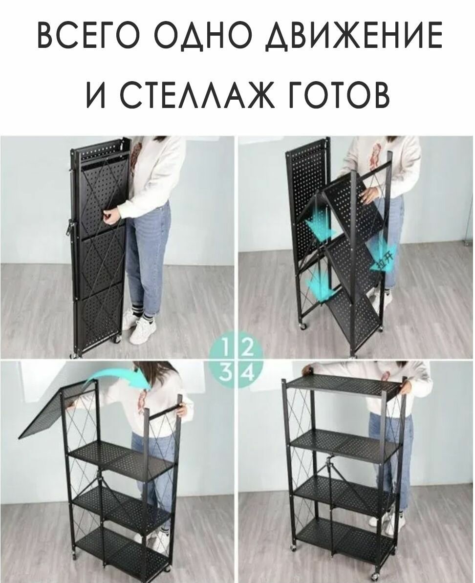 Этажерка на колесиках металлическая (4 полки) / Складной металлический стеллаж, LettBrin, 73 х 40 х 126.5 см, 4 яруса, черный