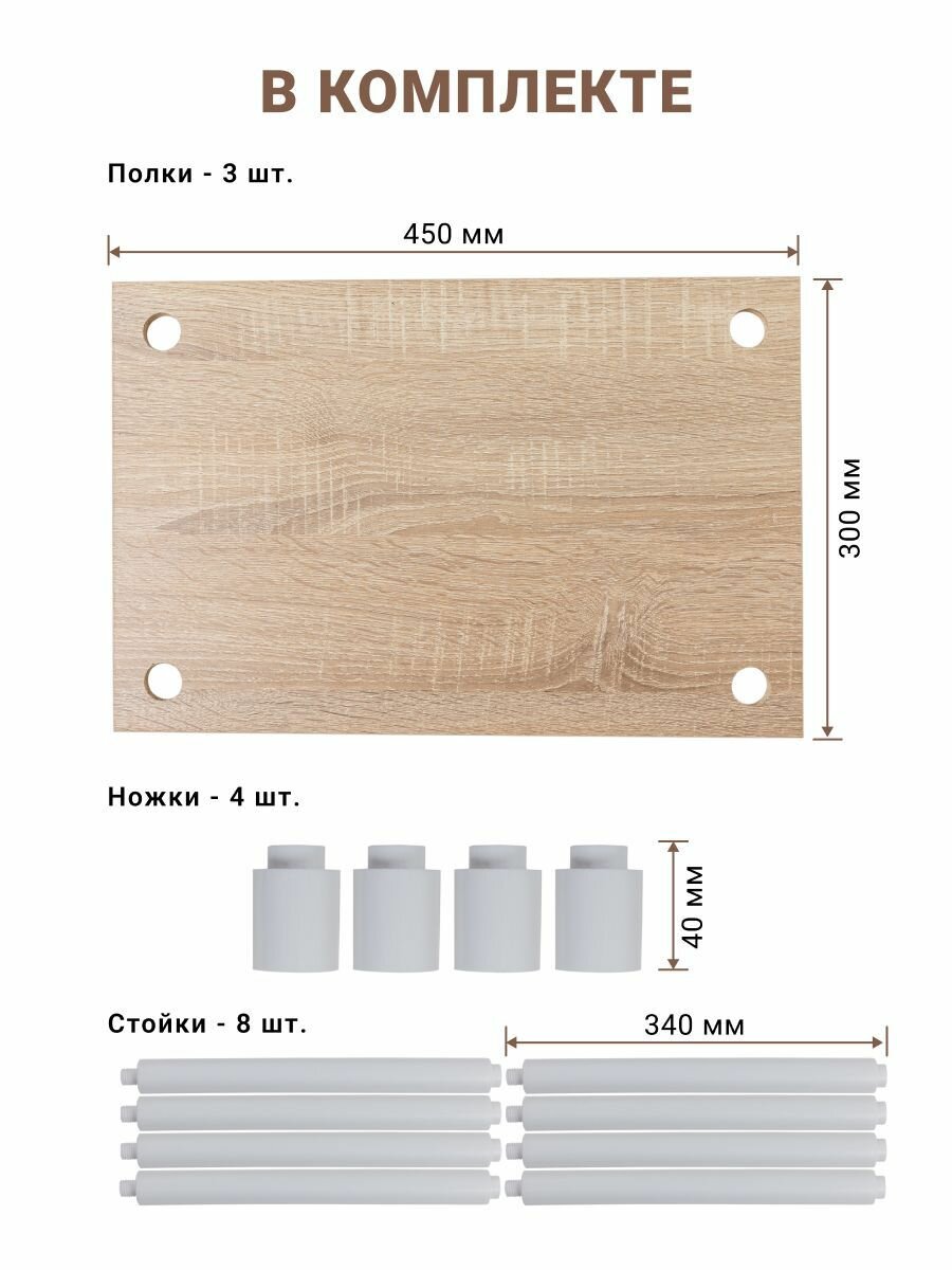 | Дополнительная информация | Полка ЛДСП с 4 футорками - 1 шт.; полка ЛДСП с 4 сквозными отверстиями - 2 шт.; стойка пластик - 8 шт.; ножка пластик - 4 шт.; инструкция по сборке |